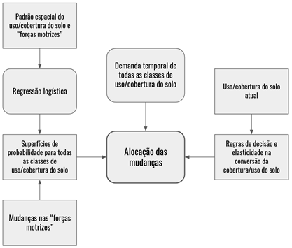 As projeções de mudanças no uso do solo na região foram realizadas a partir dos dados disponibilizados desde o ano de 1985 pelo Projeto de Mapeamento Anual da Cobertura e Uso do Solo no Brasil - MapBiomas (Souza et al., 2020), por meio de mapas de cobertura e uso do solo baseadas em mosaicos Landsat (resolução de 30 m) e utilizando o modelo Conversion of Land Use and its Effects at Small Regional Extent - CLUE-S (Verburg et al., 2002) por meio do pacote lulcc (Land-Use and Land-Cover Change) da plataforma R (Moulds et al., 2015). O modelo CLUE-S realiza a alocação de áreas a serem convertidas entre classes de uso/cobertura do solo a partir de um procedimento iterativo envolvendo fatores não espaciais, como demanda temporal (projeções de aumento ou diminuição de área de cada classe) e regras subjetivas como matriz de decisão (indica as possibilidades de conversão entre classes) e elasticidade (capacidade de retorno de uma classe para a anterior), e fatores espaciais, como a distribuição atual das classes de uso/cobertura do solo e outros fatores que influenciam nas conversões, como distância de vias, unidades de conservação, planos diretores, etc (Figura 4). Os códigos de programação do pacote LULCC são descritos por Moulds et al. (2015) e também no manual de referência (Moulds, 2019).