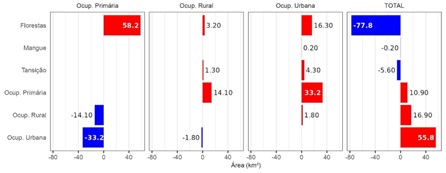 Avaliando-se as transições verificadas entre as classes de uso/cobertura do solo entre 1985 e 2020, verifica-se um aumento da ocupação humana em detrimento principalmente das áreas de Florestas, no entanto esta transição ocorre principalmente por intermédio da classe Ocupação Primária, responsável por 75% da perda de áreas de Floresta. As outras classes de ocupação avançam principalmente sobre áreas de Ocupação primária, sendo a Ocupação Urbana a única a avançar sobre todas as categorias (Figura 5). As áreas classificadas como Ocupação Primária representam, a partir destes resultados, áreas com atividade agrícola incipiente/intermitente ou regiões onde ocorre uma supressão da vegetação, objetivando uma expansão da Ocupação Urbana em curto prazo.