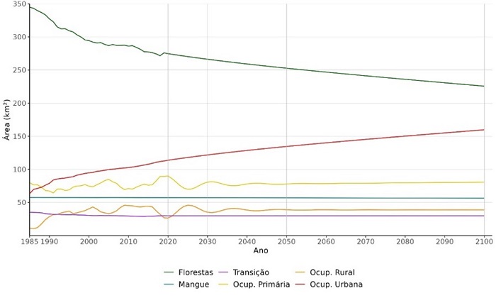 Os valores de área para cada classe de uso/cobertura do solo entre 1985 e 2020 indicam para um contínuo aumento das áreas de Ocupação Urbana e redução das áreas de Florestas, ressaltando a transferência de áreas entre estas duas classes verificada anteriormente. As demais classes não apresentaram uma tendência clara de mudança em suas áreas, mantendo-se desta forma as áreas em torno dos valores observados desde 1985. No caso da Ocupação Rural, verifica-se um aumento concentrado entre 1985 e meados da década de 90, seguida de uma oscilação das áreas em torno de 38 km2. As projeções entre 2020 e 2100 seguiram estes padrões, ou seja, um aumento contínuo da Ocupação Urbana em detrimento das Florestas, com as demais classes não apresentando tendências, mantendo-se contínuas na projeção (Figura 6).