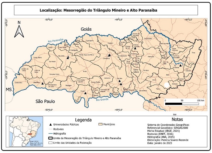 A Mesorregião do Triângulo Mineiro e Alto Paranaíba está localizada no oeste do estado de Minas Gerais, sendo composta por 66 municípios e uma população que já ultrapassou os 2 milhões de habitantes (IBGE, 2022) (Figura 1). O formato triangular peculiar desta mesorregião é condicionado aos recortes promovidos pelo Rio Paranaíba (bacia do Rio Paranaíba) ao norte e do Rio Grande (bacia do Rio Grande) ao sul (Figura 1), os quais após a confluência dão origem ao Rio Paraná.