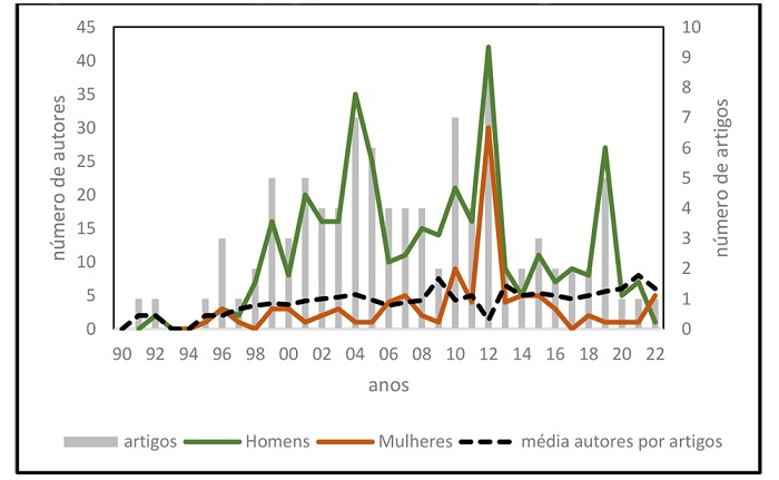 Dos 99 artigos selecionados para metanálise pôde ser observada uma maior concentração de esforços entre os anos 2000 e 2014 em volume de produção científica. Esta produção ainda traz as marcas de uma ciência dominada pelo sexo masculino, mesmo quando analisados os dados mais atuais para o recorte de estudo. O número de autoras do sexo feminino ter permanecido de certa forma constante ao longo do recorte estudado contradiz um movimento de maior participação de mulheres na ciência, mesmo que menos expressivo nas Engenharias e Ciências Agrárias (Grossi et al., 2016; Oliveira et al., 2021).