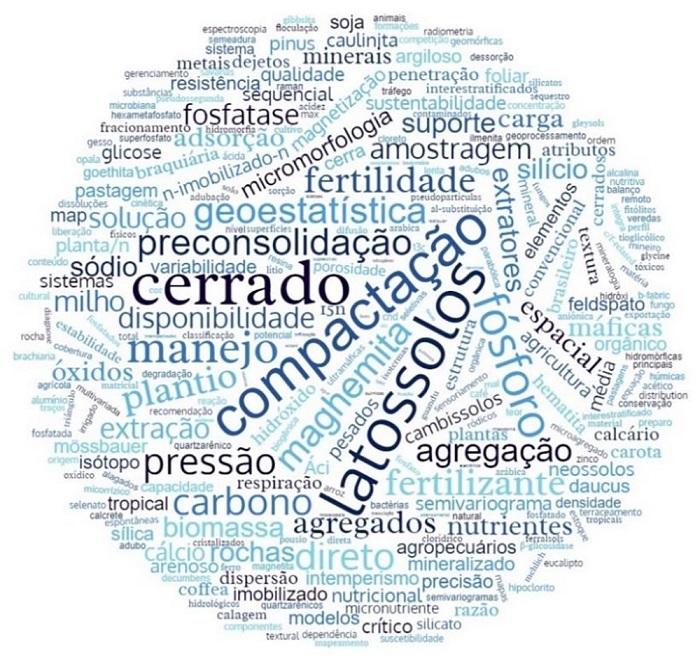 Ao se analisar as temáticas centrais dos artigos, as publicações apresentaram grande variedade de enfoques ao longo do tempo. Todavia, a partir da análise das palavras chaves eleitas pelos autores, foi possível observar uma certa predileção por temas que envolvem aspectos da caracterização geral dos solos, mas também outros que aprofundam os conhecimentos em assuntos específicos, como disponibilidades de elementos químicos de interesse agronômicos, minerais primários e o comportamento do fósforo no solo (Figura 4). Tais temas corroboram com resultados já conhecidos de solos oxídicos altamente intemperizados encontrados por todo o domínio do TMAP.
