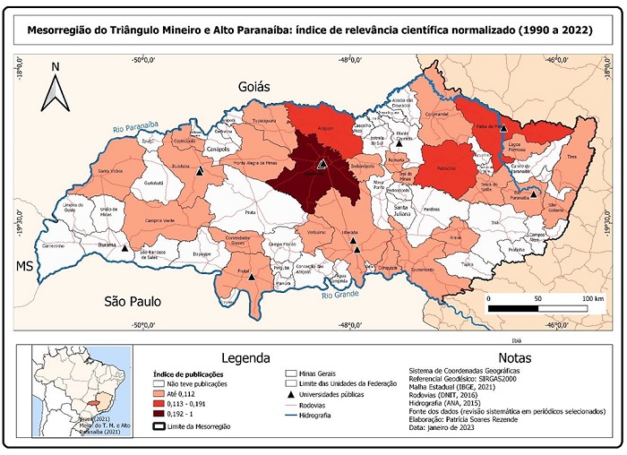 Com o objetivo de mapear a relevância científica de cada município, o índice foi normalizado, correspondendo a zero o município que não tem nenhuma produção acumulada no período e um para o município que agregou maior número de artigos recentes e com maior participação de pesquisadores de diferentes partes do Brasil e do Mundo.