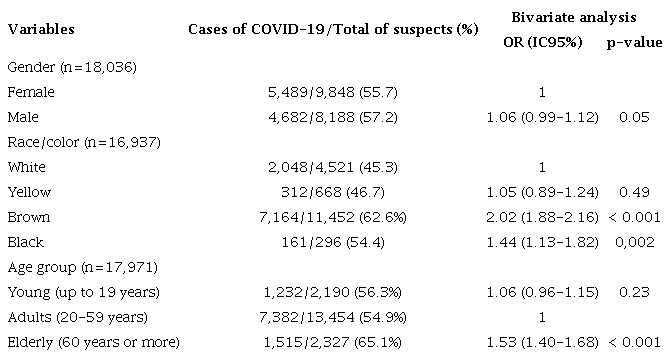 In our analysis of sociodemographic data, we found no difference in the occurrence of COVID-19 based on gender (table 1). However, we observed that brown individuals were twice as likely to have the disease compared to white individuals, and black individuals were almost 1.5 times more likely.