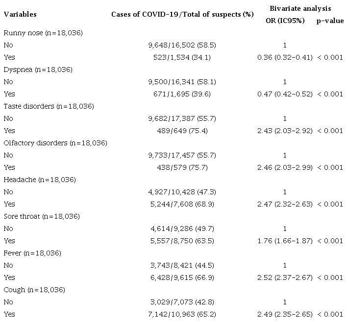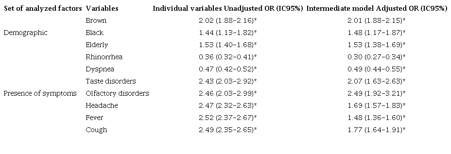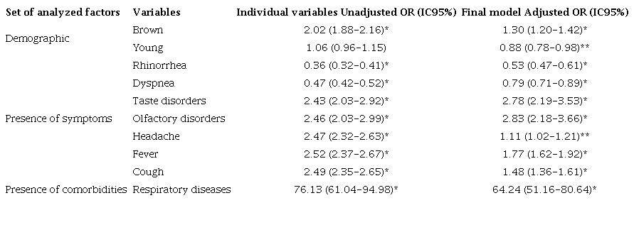 The demographic data showed that individuals of brown and black ethnicities, as well as elderly people, remained risk factors for COVID-19 (OR 2.01, CI 1.88-2.15; OR 1.48, CI 1.17-1.87; OR 1.53, CI 1.38-1.69, respectively). These results were consistent with the bivariate analysis. In terms of symptoms, taste and olfactory disorders, along with headache, cough and fever continued to be associated with COVID-19 in cases that did not require hospitalization (services in Basic Health Units). However, the statistical significance of most symptoms decreased in the intermediate logistic regression model. The final logistic regression model confirmed that individuals of brown ethnicity were 30% more likely to have COVID-19 within the scope of care at Basic Health Units (see table 4). Additionally, the age group corresponding to younger people was found to be a protective factor against COVID-19 (OR 0.88, CI 0.78-0.98).