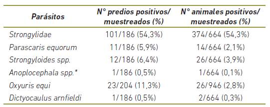 La prevalencia de parásitos identificados a nivel de familia se muestra en la Tabla 1. De mayor a menor prevalencia se detectaron huevos para Strongylidae (54%) Strongyloides spp (3,(9%, Oxyuris equi (2(8% Parascaris equorum (1(8%, Dictyocaulus arnfieldi (03%) y Anoplocephala spp (01%).