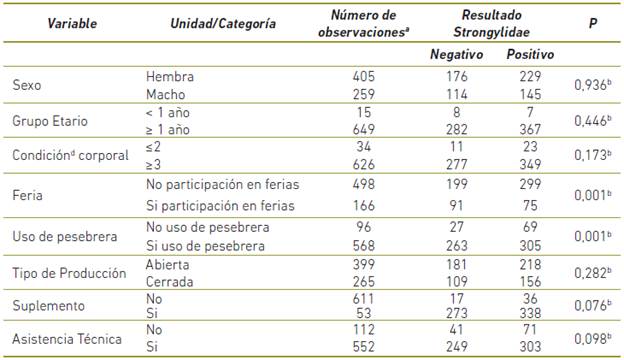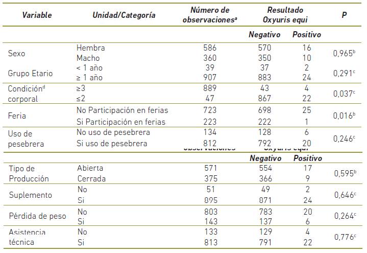 Dado que los parásitos Strongylidae y Oxyuris equi fueron los más prevalentes! se efectuó un análisis de los principales factores asociados a su presentación. En las Tablas 2 y 3 se presentan algunos de los principales predictores que fueron analizados y los resultados de la asociación. Se destacan variables como la participación en ferias׳ el uso de presebreras y la asistencia técnica.
