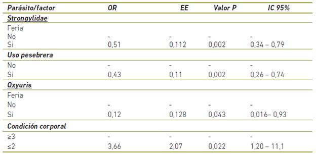 El OR "odds" de presentar Strongylidae fue 49% menor en equinos que participan en ferias en comparación con los que no lo hacen. El "odds" de presentar Strongylidae fue 56% menor en equinos que usan pesebrera en comparación con los que no la usan.