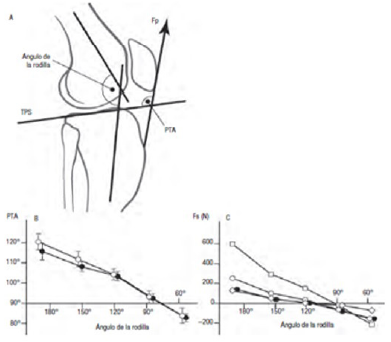 Nisell (1985) señala que existen fuerzas de adherencias variables puntualmente en la articulación femorotibial, la cual está dirigida hacia craneal y caudalmente dependiendo del ángulo de extensión y flexión de la articulación (ángulo del tendón patelar (PTA) y la dirección de la fuerza de la adherencia tibio femoral por el PTA.