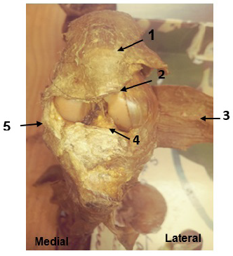 La disección se inició desde el margen medial de la articulación aislando piel, tejido subcutáneo y fascia muscular para la observación extracapsular de la rodilla. Posterior a ello se refleja la musculatura extensora, presentando gran adherencia a nivel de los músculos vastos (lateral y medial) y flexora de ella. El tendón patelar es aislado permitiendo visualizar cranealmente el estrato fibroso de la capsula articular (Figura 2). Al despejar completamente las estructuras tendinosas y musculares de esta articulación, se puede observar desde sus márgenes mediales y laterales la presencia de los ligamentos colaterales (medial y lateral).