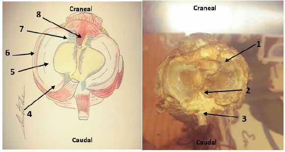Una vez diseccionado todo lo extracapsular, se realiza una incisión en el margen craneal del estrato fibroso sinovial, permitiendo exponer las estructuras intracapsulares entre las cuales se distingue: meniscos, ligamentos cruzados y estructuras vasculares. Los meniscos se observan como discos semilunares de tonalidad blanquecinas, siendo el menisco medial fino y cóncavo a diferencia del menisco lateral el cual es más grueso y convexo, acompañado de una coloración más oscura lo que se condice a su mayor capacidad de vascularización (Figura 3).