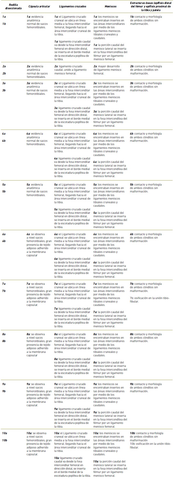 En la tabla 1 se muestran los resultados obtenidos en las disecciones de las rodillas de caninos.