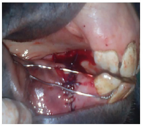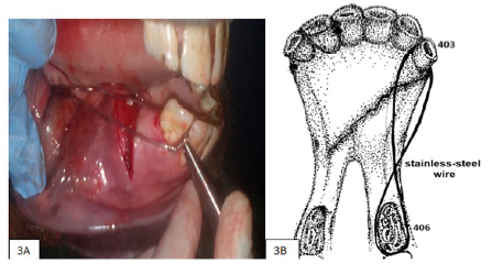 El primer paso de la cirugía es el desbridamiento del sitio de fractura. Comida, sangre coagulada y fragmentos de hueso son retirados para facilitar la reducción. Una cureta ósea fue utilizada para emparejar los bordes del hueso expuesto. Después la cavidad oral y los extremos de los huesos fracturados se lavaron con solución salina estéril y se desinfectó con clorhexidina al 0,12%. Inicialmente se perforó con una broca calibre 1,4 mm un orificio entre los espacios interalveolares de los incisivos 402 y 403 e igualmente entre los premolares 406 y 407. Para abordar los premolares se hizo una incisión en la piel de los carrillos para pasar la broca directamente hasta el espacio de los premolares. El alambre de cerclaje de calibre 1,2 mm se entrecruza en los extremos hasta generar un mayor soporte y resistencia a las fuerzas de rotación entre la porción del cuerpo mandibular con la región suelta del espacio interdentario del cuerpo de la mandíbula (Figura 3A y 3B) Los extremos de los cables se retorcieron en el lado craneal de la mandíbula justo debajo de los dientes incisivos mandibulares para la reducción de la fractura usando alicates. Los extremos afilados de los nudos de alambre se doblaron para evitar la irritación de los tejidos blandos (Figura 4). Adicionalmente, se suturó la mucosa gingival con Vicryl No 1 con un patrón de sutura continua.