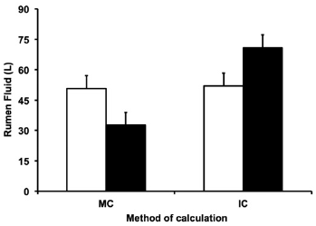 The volume of rumen fluid was greater when cows fed only forage than for those fed forage plus concentrate when the calculation was based on the moisture content of rumen digesta (Figure 1). However, there was interaction between diet and calculation method, so when the calculation was done by the exponential curve of chrome dispersion in the rumen fluid the amount of rumen liquid was greater in the concentrate containing diet than in the forage diet.