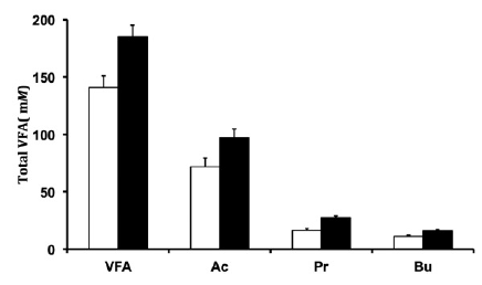 When evaluating the ruminal pH, we verified that the pH was higher in forage diet than in the concentrate containing diet (Figure 2). We also found that supplementation with concentrate resulted in higher concentration of total VFA, acetate, propio nate and butyrate (Figure 3).