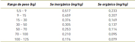 Según el National Research Council (2012) señala que los lechones requieren 0,3 ppm mientras que los cerdos en finalización y cerdas en fase reproductiva necesitan 0,15 ppm de selenio, estos requerimientos nutricionales son considerados como mínimos y han sido desarrollados a partir de experimentos de dosis-respuesta 20. Por su parte Rostagno et al., (2017) para cerdos en crecimiento hace una sugerencia más minuciosa respecto a este micro-mineral que se detallan en la Tabla 1. Mientras que para cerdos en etapa de reproducción recomienda 0,397 mg/kg o ppm (Se inorgánico) y 0,178 mg/kg (Se orgánico). Las tablas brasileñas de requerimientos nutricionales desarrollados por Rostagno et al., (2017) tienen por objetivo una producción más económica de cerdos y han sido desarrolladas tras investigaciones de dosis-respuestas en Universidades del Brasil 31.