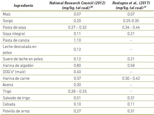 Se debe considerar que las dietas tradicionales para la alimentación de cerdos incluyen materias primas a base de maíz, sorgo, soya entre otras, que por sí solas no alcanzarían a cubrir el nivel de selenio requerido por el animal. Por lo tanto el nivel de suplementación de Se a través de la premezcla mineral debe ser balanceada con el aporte de las materias primas. En la tabla 2 se presenta el aporte de Se de los principales ingredientes utilizados en la alimentación porcina: