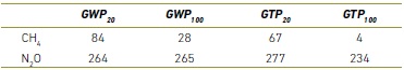 Los potenciales de calentamiento global (GWP) se utilizan para comparar el impacto relativo de diferentes gases de efecto invernadero (GEI) en el forzamiento climático, al convertir las emisiones en "equivalentes de CO2" o CO2e. Se define como el forzamiento radiativo promedio (integrado en el tiempo) de una emisión de impulsos en un horizonte temporal definido, en comparación con el CO2. GWP se usa ampliamente en aplicaciones industriales, regulatorias y académicas para comparar el efecto de un cambio en el producto o proceso. El horizonte de tiempo de 100 años es el más común, lo que da un valor equivalente de CO2 de 28 a 36 para el metano (dependiendo de si se incluyen varios efectos climáticos indirectos). Sin embargo, hay muchas críticas sobre el uso de GWP, porque (Balcombe et al., 2018):