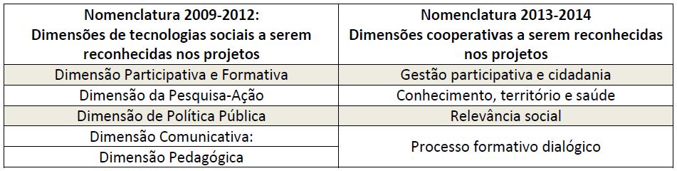 Entre 2013 e 2014, a Fiocruz apresentou 27 Indicadores de Cooperação Social para avaliação de projetos aprovados nos novos editais da entidade, conjugando a experiência anterior da instituição, aqui descrita, e a metodologia do Instituto de Tecnologia Social (ITS) para o Sistema de Acompanhamento de Tecnologias Sociais para Universidades (SATECS/UNI) ( FIOCRUZ, 2014). Estes foram organizados segundo quatro dimensões que guardam muita correspondência com aquelas aqui definidas, mas não são idênticas, uma vez que - de maneira diversa da metodologia anterior - foram desenvolvidas por meio de um único Grupo de Trabalho, formado exclusivamente por profissionais designados por unidades da Fundação, em debate com algumas personalidades e pesquisadores afeitos à temática.