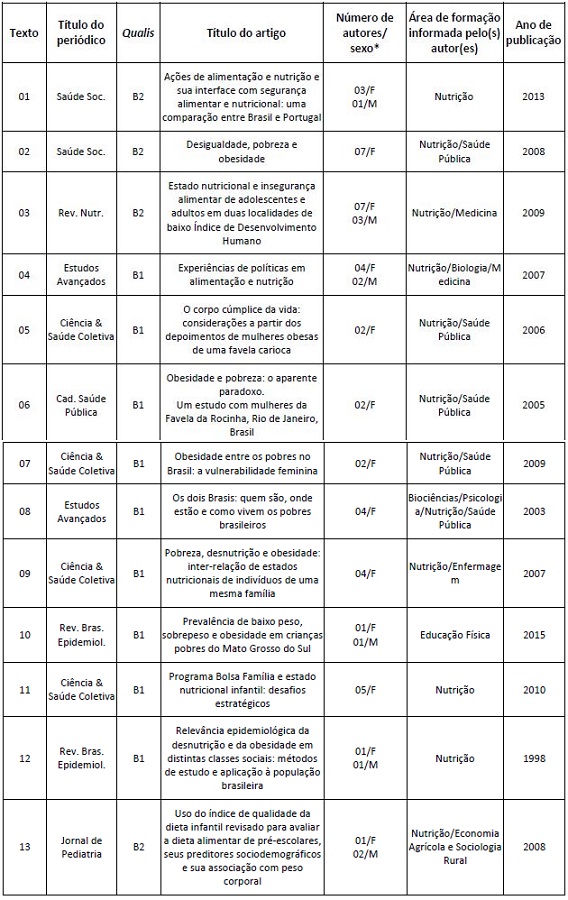 No conjunto, a revista Ciência e Saúde Coletiva se destacam pelo maior número de publicações, totalizando quatro artigos. Seu Qualis para a Saúde Coletiva é B1, sendo sua avaliação equiparada a dos demais periódicos. A prevalência do gênero feminino nas autorias dos artigos é expressiva, 43 mulheres para 10 homens. Nesta tendência, percebe-se a hegemonia de profissionais da área da Nutrição, associada a outras disciplinas, ora enfermagem, ora da Saúde Pública. Dos 13 textos, somente um (texto 10) não possuiu autoria e/ou coautoria de profissionais da Nutrição. Logo, a discussão acerca da obesidade parece corresponder, expressivamente, a estudos nutricionais, mesmo quando seu recorte se refere à pobreza.