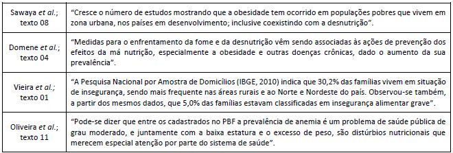 De modo geral, os textos (01, 04, 08, 11) abordam a insegurança alimentar, decorrente do pouco controle do Estado para com as políticas sociais e/ou a ausência de sua regulamentação, que gera o excesso de peso pelo acesso a determinados alimentos em detrimento de outros, podendo gerar o obeso desnutrido. O aumento da incidência da obesidade é projetado pelos artigos mencionados, conforme quadro 2, no reconhecimento da relação entre obesidade e pobreza.
