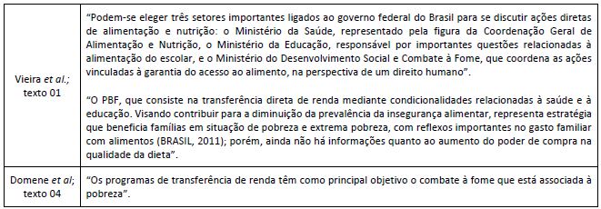 Em relação aos textos 01, 04, 08, 11, nota-se a predominância na abordagem dos aspectos políticos voltados à alimentação, que retratam sentidos vinculados: 1) ao direito ao alimento via acesso a políticas públicas; 2) à insegurança alimentar, expressa na falta ou excesso de alimentos. A falta gera desnutrição e o excesso promove a obesidade, ambas provocando doenças, para os autores, devido à desregulamentação do Estado.