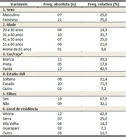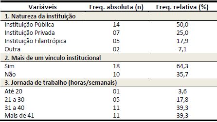 Em referência à atividade profissional, observou-se que 14 (50,0%) egressos estavam vinculados à instituição pública; 18 (64,3%) declararam mais de um vínculo institucional; e 11 (39,3%) com jornada de trabalho semanal superior a 41 horas ( Tabela 2).