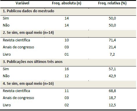 Após a conclusão do Mestrado, 21,4% dos egressos realizaram algum curso ou especialização; e 14,3% cursaram ou estão cursando o Doutorado. No que se refere à produção científica, 57,1% dos egressos têm publicações nos últimos três anos, sendo 68,8% delas em revista científica. Também, 50,0% dos egressos publicaram dados relativos às suas dissertações, em sua maioria, em revista científica ( Tabela 4), atendendo, assim, à recomendação da Capes e à exigência do Programa da EMESCAM.