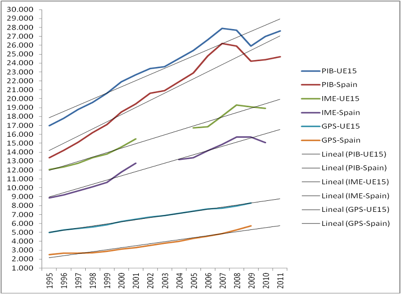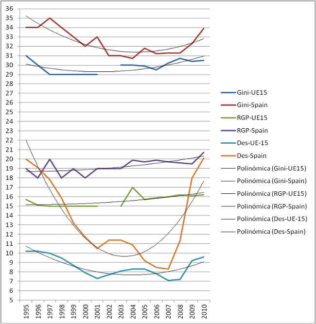 Graph 1 shows that the rate of growth of GDP (Gross Domestic Product) has been higher than the rate of growth of Equivalent Average Net Income (EAI), and that the latter has been higher than the rate of increase in Social Protection Expenditures (SPE). In other words, despite the nominal growth in GDP and Equivalent Average Net Income, real income (in work and transfers) has shrunk and the protective intensity of social protection has decrease, i.e., there has been a redistribution of wealth mediated more by the market than by the state. It can be seen by the distinct slope of the straight lines that the one for GDP of the EU15 and of Spain are much higher than SPE slope. The growth in EAI is higher than SPE, but lower than GDP. In other words, besides resulting in a more dominant role played by the market than the state in the redistribution of welfare resources, the growth in average income has been less than the growth in wealth.