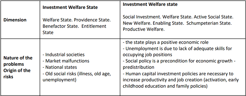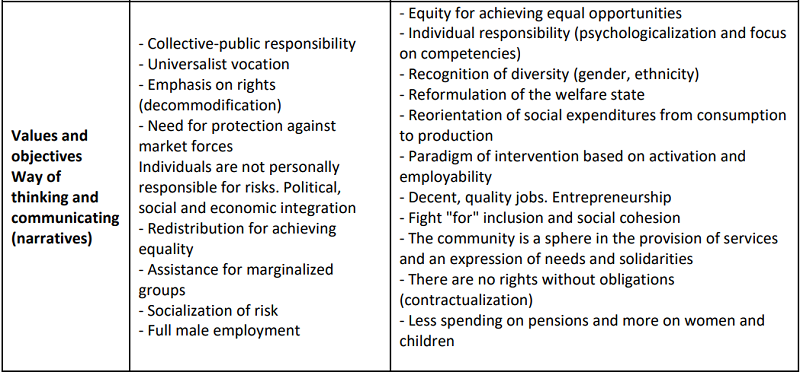 Investment welfare states do not guarantee employment but focus more on measures that will enable citizens to enhance their competencies for obtaining a job. The main change in the narrative is related to the redirecting of social spending from consumption to production, through interventions based on activation and employability. It is premised on the reorientation of employment policies from welfare to workfare, shifting the emphasis from passive policies to active policies. Workfare policies, which had spread across English-speaking countries, were reformulated on the continent as active policies. The narrative of active policies is complemented by the objective of making the labor market more flexible (reduce labor and social costs), facilitating competitiveness in a globalized context and reducing excessive protection of employment and unemployment (Barbier, 2001; Serrano, 2004).