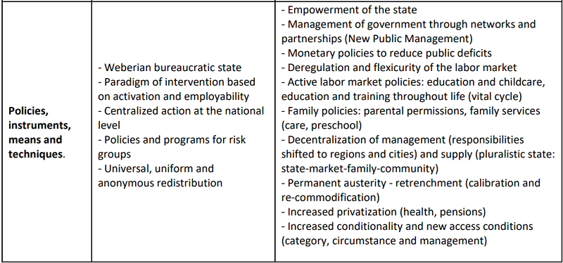 From the perspective of the social investment paradigm, the state must be empowered, and government management is proposed through networks and partnerships, with New Public Management procedures. Monetary policies are used to reduce public deficits and promote deregulation and flexicurity of the labor market. Active policies are advocated in education and childcare, lifelong training (vital cycle) and family policies and services. Decentralization of management (responsibilities shifted to regions and cities) and pluralistic supply (state-market-family-community) are also proposed. Within the context of permanent austerity, retrenchment continues to be applied, but in the form of recalibration and recommodification (Bonoli and Natali, 2012; De la Porte and Jacobsson, 2012).
