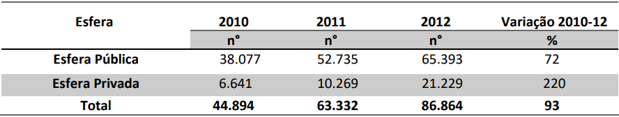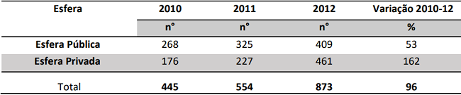 De acordo com o Dieese (2015), entre 2010 e 2012, o número de greves passou de 445, no primeiro ano deste intervalo, para 554 em 2011, chegando, no ano seguinte, a 873, registrando um aumento de 96%.