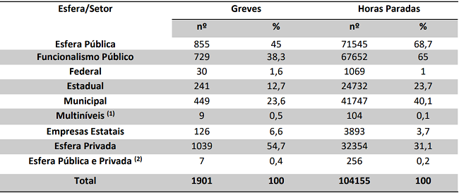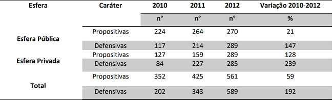 As greves na esfera pública registraram um crescimento de 53%, enquanto na esfera privada chegam a expressivos 162%. Em 2012, as greves da esfera pública deixam de ser predominantes em relação às ocorridas na esfera privada, diferente do que ocorria nos anos de 2010 e 2011. Quanto ao caráter das reivindicações, os estudos do Dieese sobre as cláusulas reivindicadas mostram que há predomínio de greves defensivas (luta pela manutenção de direitos) em relação às greves propositivas (luta por novos direitos).9
