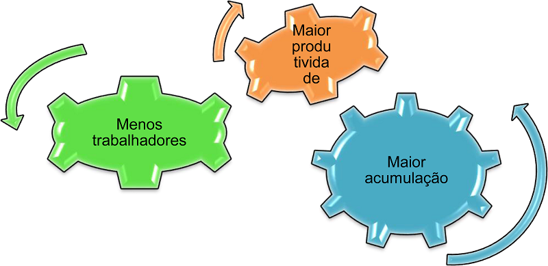 Através da figura acima, pretendemos indicar que o capitalismo objetiva aumentar cada vez mais a produtividade com o menor número possível de trabalhadores e a consequência desse processo é gerar uma maior acumulação2.