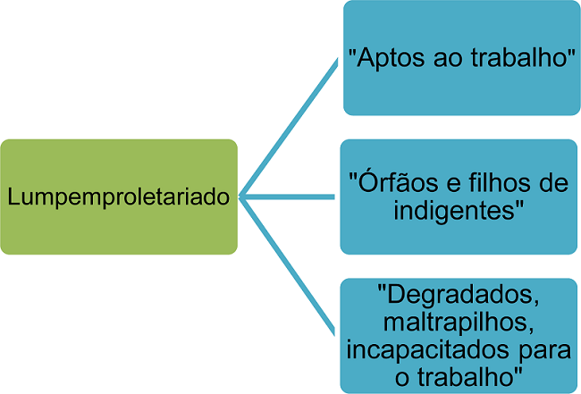 O lumpemproletariado estaria abaixo das formas da superpopulação relativa, apresentada pela figura 2. Segundo Marx (2013), é o “sedimento mais baixo”, composto por capazes ao trabalho, órfãos e incapacitados para o trabalho, como evidenciamos na figura 3 acima.