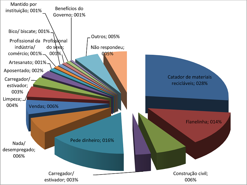 A pesquisa nacional sobre a população em situação de rua revelou que somente 15,7% das pessoas nesta situação mendiga ou pede como principal estratégia de sobrevivência, enquanto para 70,9% o trabalho é primordialmente utilizado. As atividades destacadas pela pesquisa estão presentes na figura a seguir.