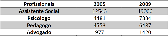 Alguns avanços no sentido de ampliação no número de profissionais atuando na Política de Assistência Social são observados após a implantação do SUAS (2005), conforme demonstram os dados do IBGE (2005 e 2009) apresentados na Tabela 1. Destaca-se o aumento no número de profissionais Psicólogos (74,8%) e no número de Assistentes Sociais (51,5%). Já o percentual de Advogados apresentou um aumento de 45,3% e, o de Pedagogos, 42,4%.