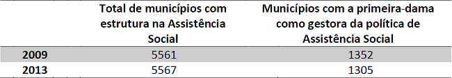 Os dados do IBGE (2009 e 2013) revelam ainda uma redução no número das primeiras-damas como gestoras da política de Assistência Social. Porém, apesar da redução ocorrida após a implantação do SUAS (2005), observa-se que esse número ainda é significativo, representando um dos grandes desafios para a superação da lógica do personalismo. Em 2009, conforme Tabela 2, dentre os municípios que declararam ter órgão gestor da Assistência Social (5561), 1.352 deles responderam que sua política de Assistência Social era conduzida pela primeira-dama, observando-se essa atuação em 24,3% dos municípios brasileiros. Já em 2013, este número cai para 1.305 municípios, correspondendo a 23,4%.