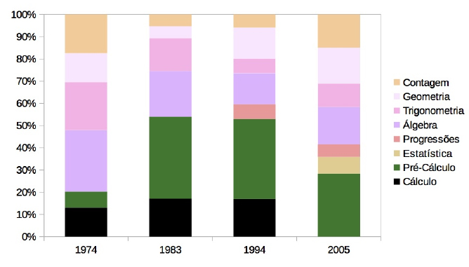 No gráfico a seguir percebemos que no ano de 1974 o Pré-Cálculo e o Cálculo eram apresentados durante quase todo o segundo ano. Em 1983 e 1999 o Pré-Cálculo já acontece em quase todo o primeiro ano e é retomado como uma espécie de revisão curta antes do Cálculo, que será ministrado no segundo ano. Em 2005 o conteúdo de Cálculo deixa de fazer parte do currículo, restando apenas o conteúdo de Pré-Cálculo.