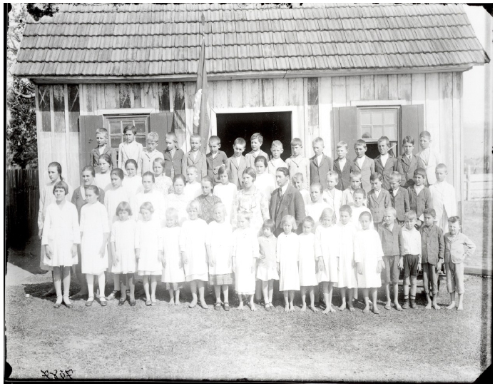 Já na segunda imagem, de uma escola pública localizada próxima a uma das colônias de imigrantes que se instalaram nos arredores da cidade, os estudantes demonstram seu nacionalismo posando de forma impecável ao redor da bandeira nacional.