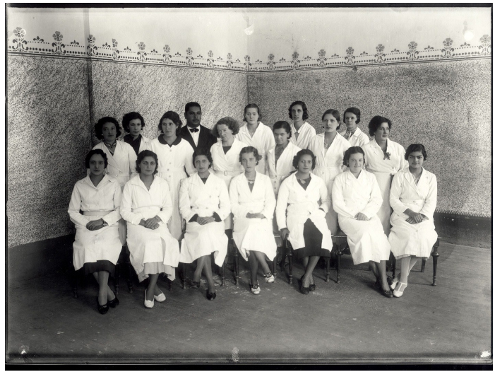Na imagem acima percebemos o ideal de postura que se desejava das professoras desde o final do século 19 e até meados do século 20, qual seja, que fossem mestras no sentido amplo da palavra e em todos os momentos: em sala de aula, na vida quotidiana, na roupa escolhidas para o dia, na pose para a fotografia. Nesta imagem todos trajam aventais impecavelmente alvos e abaixo da linha do joelho. De professoras se exigia