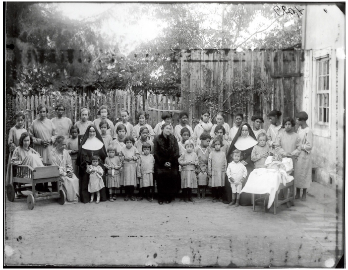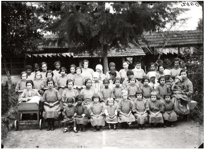 Na imagem a seguir, a fundadora da instituição na posição central com duas irmãs nas laterais, configurando uma simetria com 18 pessoas de cada lado. A fotografia tirada no fundo da casa original do Educandário localizado na Rua Barão do Rio Branco, número 1267, no centro da cidade. Na imagem seguinte, posterior à primeira em termos cronológicos, já é possível encontrar certa leveza nos rostos dos internos, possíveis reflexos, acreditamos, de uma melhoria na estrutura que dava aporte àquelas crianças e mulheres que buscavam abrigo.