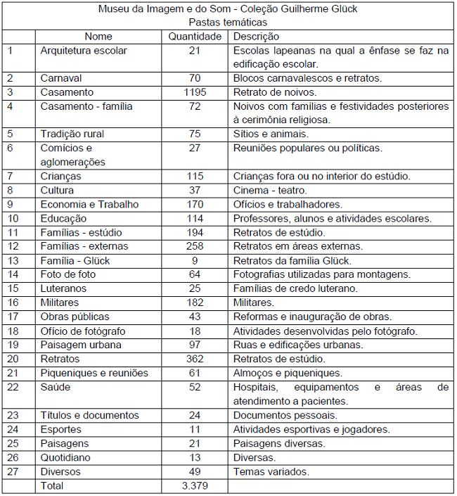 A partir das informações obtidas no quadro 1 é possível identificar e afirmar que o fotógrafo tinha, como fonte de recursos, as cerimônias de casamento, num total de 1.195 imagens, que totalizam 35% do conjunto iconográfico abordado. Com relação às fotos de casamento, Miriam Moreira Leite chama a atenção para o fato de que os inúmeros registros de casamento pelo lado feminino marcavam "um dia de glória, representado pelos cuidados com que são vestidas, admiradas e fotografadas, para os fotógrafos, os retratos de casamento podem se reduzir a uma tarefa rotineira e feita exclusivamente para ser rendosa" (Leite, 2001, p. 175). Esta análise que é confirmada pelos números da Coleção Glück.