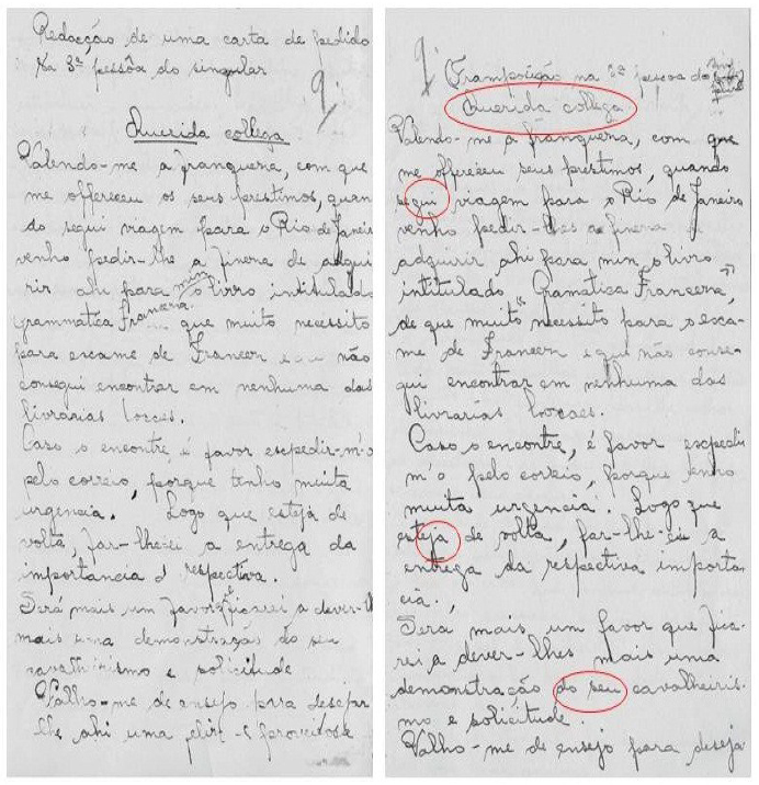 No segundo movimento desse exercício a aluna deveria transpor a carta escrita à colega para a 3º pessoa do plural. O realizado pela aluna apresenta erros de flexão de número. Logo no início da carta já é possível identificá-los. Isolina redige "Querida Collega" (sic) em vez de Queridas Colegas. Há ainda outros erros ao longo do texto, que podem ser observados em destaque na imagem. Todavia, a nota atribuída à atividade é 9 e a existência de erros não foi identificada ou sinalizada pelo professor.