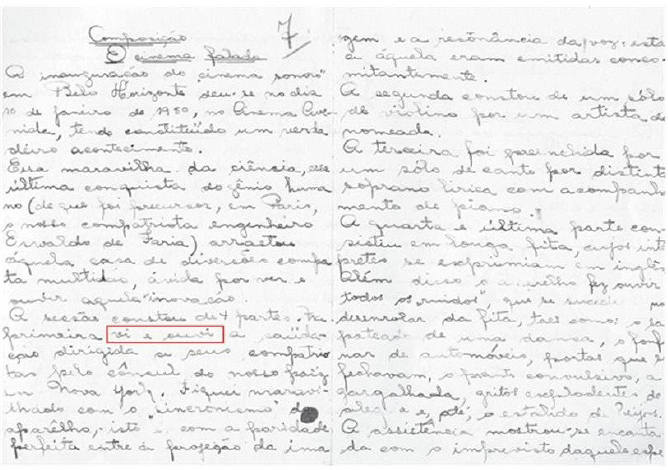 No caderno de Isolina Gamborgi encontram-se sete composições sobre os seguintes temas: um espetáculo teatral, uma fita cinematográfica, uma floresta, sobre o cinema falado, a visita a uma mina de ouro, o combate naval de Riachuelo e sobre uma árvore que cantava. Nestes textos é possível entrever frestas de criatividade e fruição como, por exemplo, na composição sobre o cinema falado em que, alguns excertos da redação, a normalista coloca-se em situações vividas pelo acontecimento, como mostra o destaque na imagem. A narrativa perpassa duas páginas e meia do caderno, o que, se comparado com outras produções escritas como as cartas, por exemplo, é significativa.