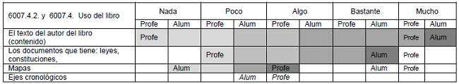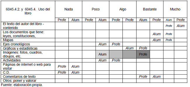 Para profundizar en todas las informaciones recogidas en los libros, recurrí a dos casos: el libro usado de primera mano y el que era de segunda mano. No aspiraba a presentar un mapa del uso, sino a explorar una realidad compleja que precisa de descripciones en las que el soporte, la manipulación y la intencionalidad tienen que ir lentamente indagándose. Se ha concretado en dos de las alumnas participantes en las encuestas, que se han singularizado por utilizar el libro recomendado por el centro, ser o no utilizado por el profesor, usar el manual nuevo o de segunda mano y tenerlo de consulta por el alumnado21. Ambas participantes declaran que el Instituto tiene recomendado el libro, pero que en el caso de la primera (600722), el profesor no lo utiliza en clase y debían ampliar los temas en casa23, mientras que la segunda (6045) declara que el profesor lo utilizaba en el aula24. De acuerdo con estas situaciones de partida, se les pidió a ambas estudiantes que recordasen "el uso de las informaciones que contiene el manual" en el aula (por parte del docente) y el que hacían ellas en casa (para estudiar)25. Los resultados se recogen en las tablas 2 y 3. En ellas se muestra las diferencias y concomitancias habidas. En la tabla n. 3, participante 6007, las diferencias entre el docente y la alumna son manifiestas, pues en casa ella hace un uso del "texto de autor, los documentos e incluso los mapas" distinto y claramente diferenciado del docente. Por otra parte, sí hay acuerdo de uso en el aula y en casa en las demás características de los manuales. Por su parte, las valoraciones de la segunda (participante 6045), tabla n. 4, ponen de manifiesto una utilización en el aula y en casa muy de acuerdo con las condiciones fijadas por el docente, solamente encontrando diferencias cuando se refieren a las imágenes. En ambos casos hay un uso del libro complementario, bien de ampliación o de confirmación de los contenidos.