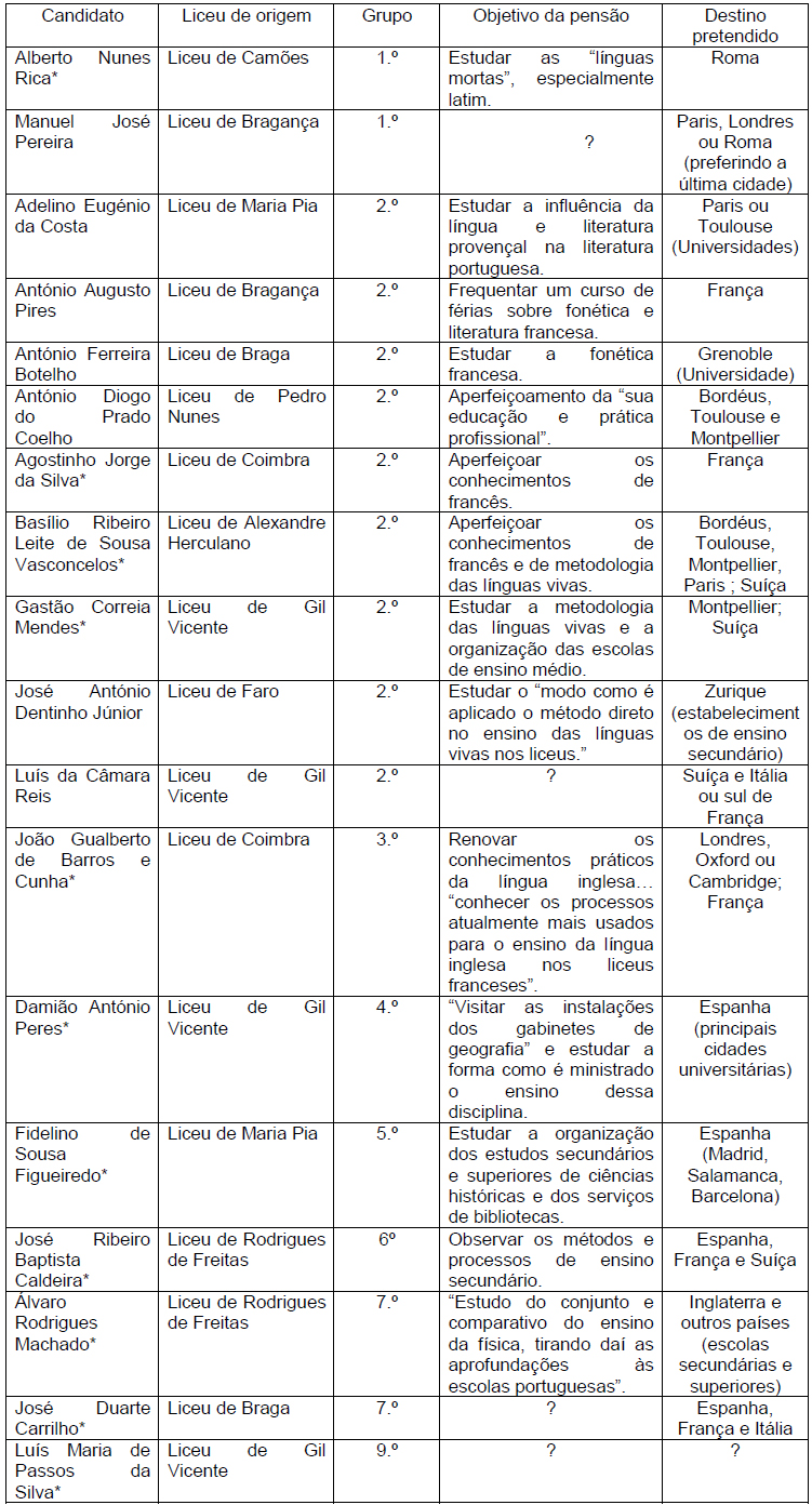 Documentação de arquivo deixa, na verdade, perceber que a escolha dos candidatos teve em conta o mérito próprio. Entre os bolseiros ou pensionistas contam-se, por exemplo, personalidades como Damião Peres6 e Fidelino de Figueiredo.7 Por outro lado é interessante notar que alguns dos candidatos foram preferidos pela circunstância de serem, cumulativamente, professores de metodologia das Escolas Normais Superiores. Os docentes em causa estavam "naturalmente indicados para a viagem, visto que aperfeiçoados eles, aperfeiçoado ficará o ensino feito depois e consequentemente mais habilitados os alunos-mestres" (Ahmec, Ministério da Instrução Pública, documentação em fase de tratamento arquivístico).
