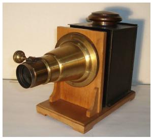 También se dispone de aparatos representativos del uso del cine en la escuela. El Museo cuenta con 3 máquinas de cine de diverso cortometraje, aunque lo más destacado sea la colección de más de 100 películas que fueron utilizadas en los años 60 y 70 para la didáctica de diferentes materias. Como antecedente del cine el Museo tiene 2 linternas mágicas (Figura 06), de principios del siglo XX, así como una pequeña colección de transparencias grabadas en vidrio.
