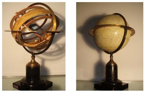 Igualmente merece recordar la colección de mapas y de láminas para la enseñanza de la Geografía y la Historia Natural. La mayor parte fueron editadas en la primera mitad del siglo XX, predominando los elaborados por editoriales francesas y españolas. Asimismo, para la didáctica de la Geografía se cuenta también con una esfera armilar y un globo terráqueo (Figura 07) fabricados en el siglo XIX, de gran valor, así como una bola del mundo moderna.