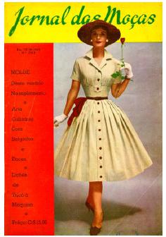 Nesse sentido, ambas as fontes tratavam de “temas cujos referenciais obrigatórios eram os papeis domésticos tradicionalmente reservados às mulheres e as características consideradas “próprias de mulher”, englobadas na ideia de “feminilidade” que então se difundia” (PINSKY, 2014, p.23). Nesse sentido, disseminavam a aprendizagem tanto para o consumo de moda quanto para a profissionalização feminina para o mercado de produção de roupas. O Jornal das Moças (1914-1965), revista carioca produzida pela Editora Jornal das Moças Ltda., era um periódico semanal que teve seu primeiro número publicado em maio de 1914, permanecendo no mercado até dezembro de 1961 (SANTOS, 2011). A revista de maior vendagem nas décadas de 1940-1950, transforma-se em exemplar suporte à compreensão da pedagogia de gênero presente no Método Vogue, pois eram em suas páginas que as jovens e senhoras encontravam orientações sobre moda, beleza, casa, culinária e cuidados com os filhos (LUCA, 2012, p. 448), complementando a educação feminina no período.